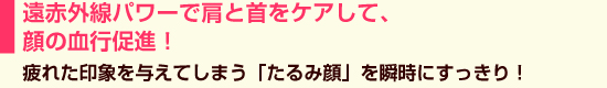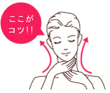 肩から首筋にかけて、手の平でマッサージをしながらよく擦り込みます。手の平の温度で遠赤外線効果がアップ!顔や首のケアは、中心から外へ、下から上へ引き上げるようにすると効果的。